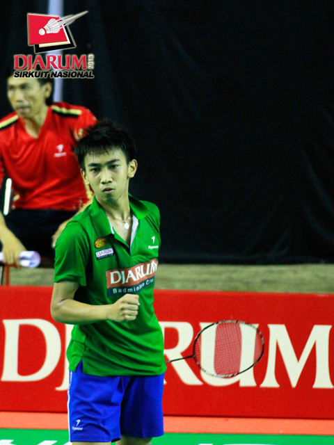 Ekspresi Revindra Rayhaldi (PB Djarum) setelah berhasil mengalahkan Agil Wahyudi (Jaya Raya Metland) melalui laga sengit.