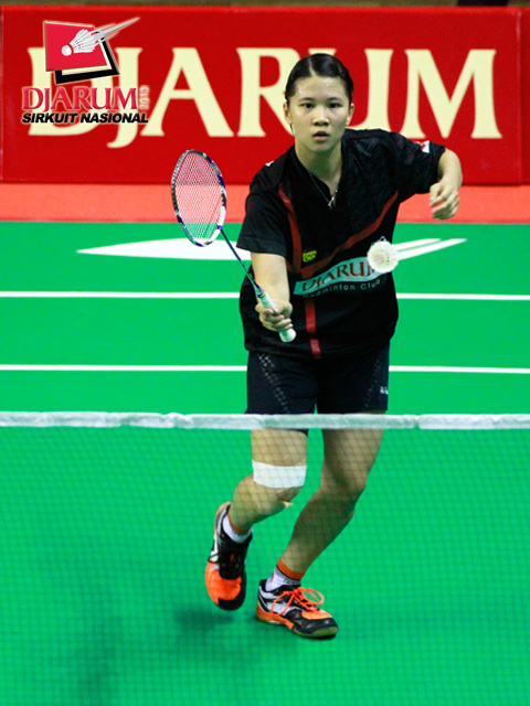 Sylvinna Kurniawan (PB Djarum) bersiap mengembalikan kok ke arah Dian Fitriani (Pusdiklat Jaya Raya).
