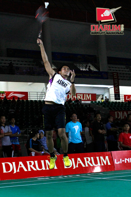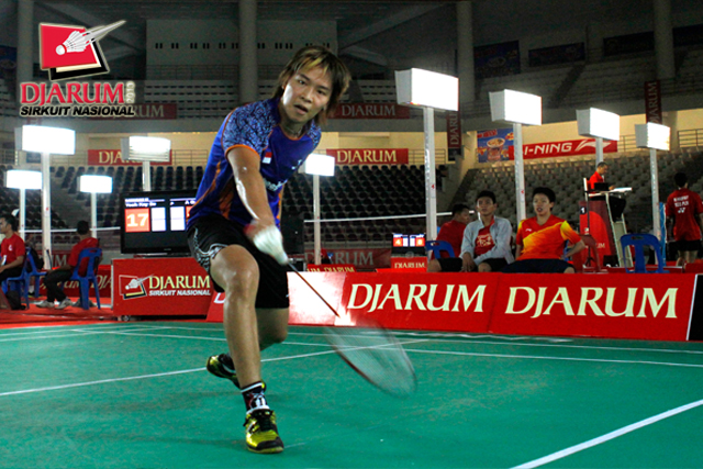 Reksy Aureza (PB Djarum) mengembalikan shuttlecock ke arah Bandar Sigit Pamungkas (Sarwendah).