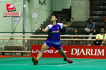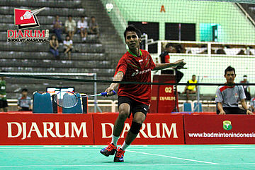 Kho Hendriko (PB Djarum) mengembalikan shuttlecock ke arah Alamsyah Yunus (Pertamina Indonesia).