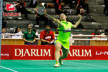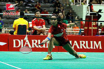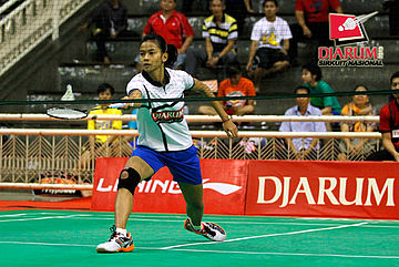 Marsa Indah (PB Djarum) mengambil ancang-ancang untuk melepaskan smash.