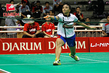 Ana Rovita (PB Djarum) berhasil menggapai pengembalian dari Novalia Agustianti (Tangkas Specs).