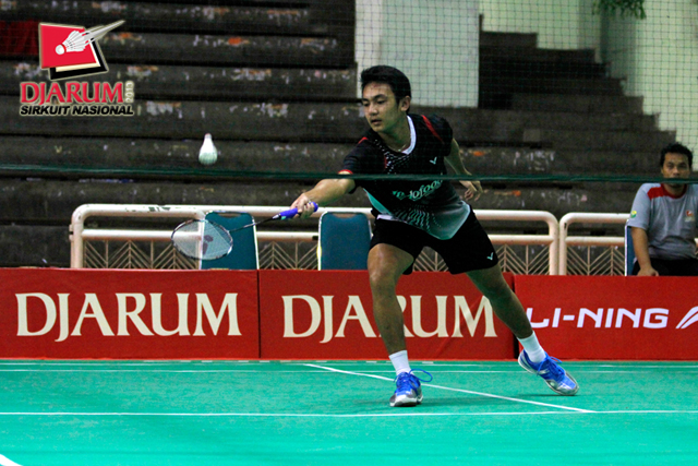 Rudi Cahyadi (PB Djarum) mengembalikan shuttlecock ke arah Evert Sukamta (Tangkas Specs).