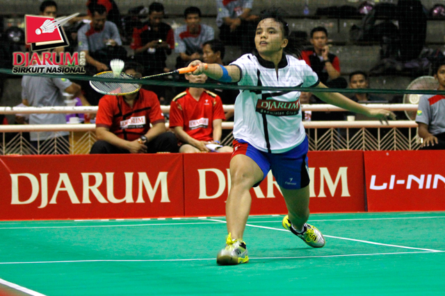 Dinar Dyah Ayustine (PB Djarum) mengembalikan shuttlecock ke arah Tike Arieda (Jaya Raya Suryanaga).