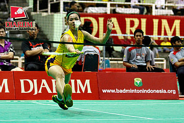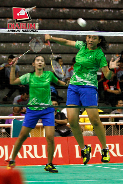 Deariska Putri/Nurbeta Kwanrico (PB Djarum) mengembalikan shuttlecock ke arah Aris Budiharti/Ery Oktaviani (Jaya Raya).