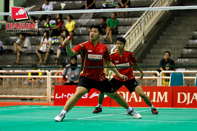 Akbar Bintang/Kevin Ersa (PB Djarum) bersiap menyambut pengembalian dari Hantoro/Ricky Alverino (PB Djarum).