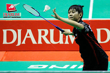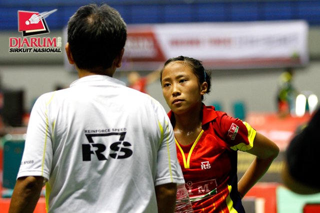 Khristin Thonia (Pendowo) gagal mengembalikan shuttlecock ke arah Liony Citra (Bintang Utama).