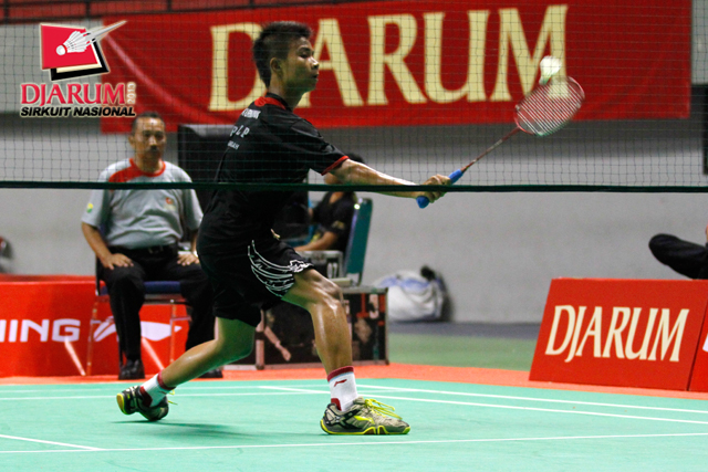 Kurniawan (PPLP Jateng) mengembalikan shuttlecock ke arah Yudha (Hero Bali).