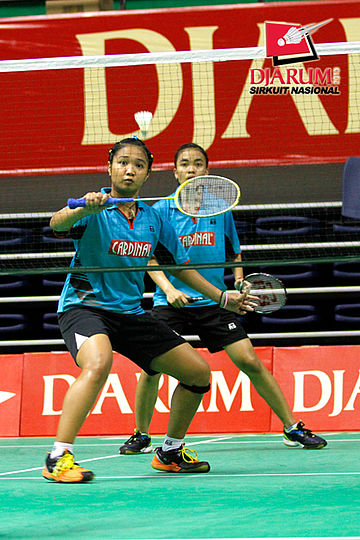 Linda Mutiara/Sinta Arum (Mutiara Bandung) bersiap mengembalikan shuttlecock ke arah Chintia Rhizta/Ristya Ayu (PB Djarum).
