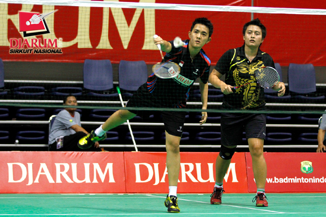 Rahmat Adianto/Seiko Wahyu (PB Djarum) mengembalikan shuttlecock ke arah Rendra Wijaya/Rian Sukmawan (Musica Champion).