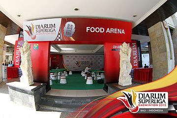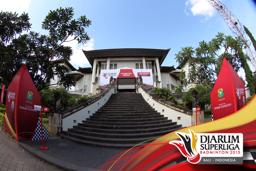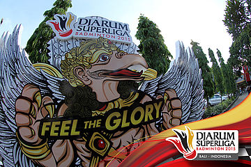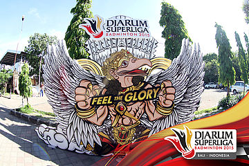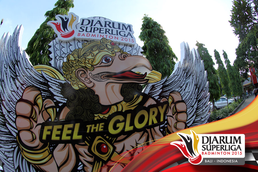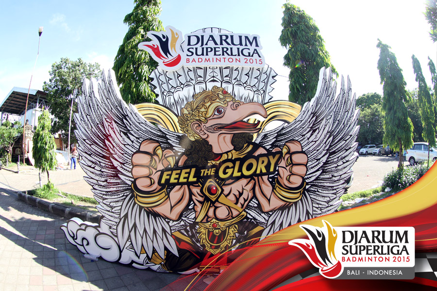 Ikon Djarum Superliga 2015 dengan Tagline “Feel The Glory” menghiasi pintu masuk utama GOR Lila Bhuna Denpasar, Bali.