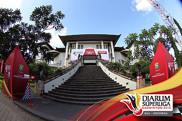 Suasana pintu masuk utama GOR Lila Bhuana saat persiapan Djarum Superliga 2015 Denpasar, Bali.