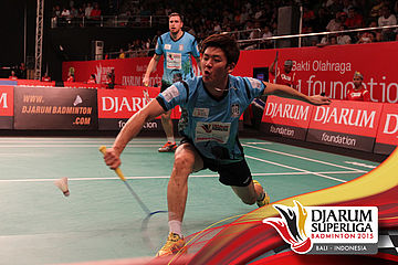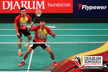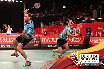 Lee Yong Dae/Vladimir Ivanov (Musica Champion) berusaha menggapai pengembalian dari Rian Agung/Trikusuma Wardana (Jaya Raya Suryanaga).