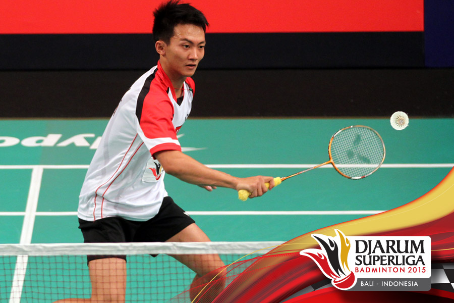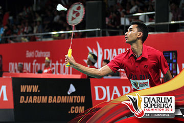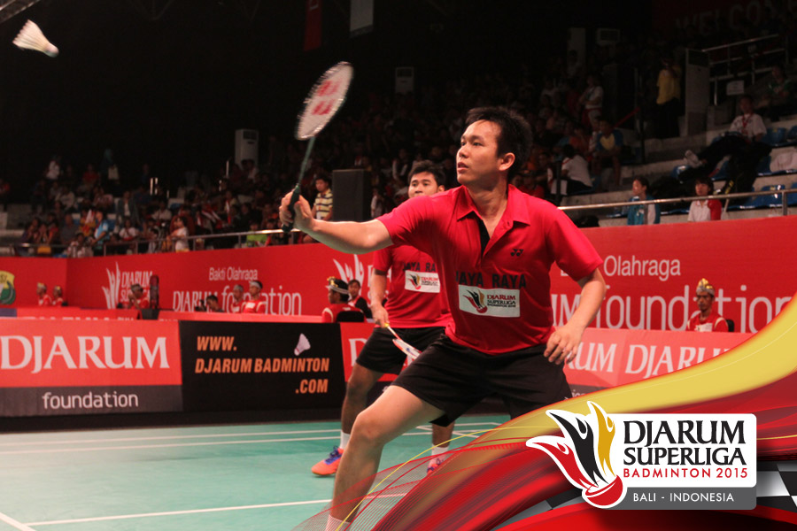 Tommy Sugiarto (Jaya Raya) mengembalikan shuttlecock ke arah Thomi Azizan (USM Blibli).