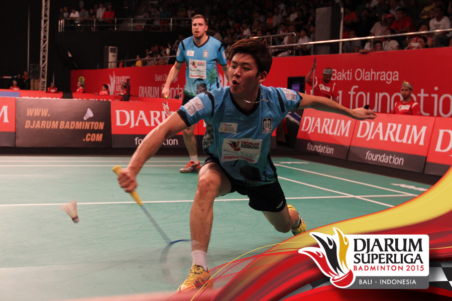 Lee Yong Dae/Vladimir Ivanov (Musica Champion) saling berkoordinasi saat bertanding.