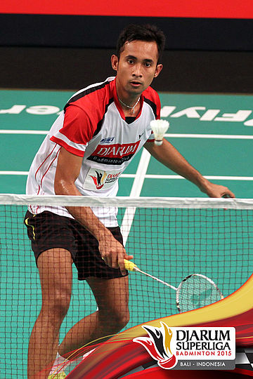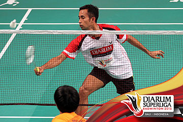 Firman Abdul Kholik (Mutiara Cardinal) mengembalikan shuttlecock ke arah Sho Sasaki (Tonami Jepang).