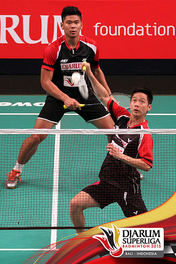Flandy Limpele/Yuta Yamasaki (Hitachi Jepang) bersiap menghadang serangan yang dilepaskan Kevin Sanjaya/Praven Jordan (Djarum Kudus).