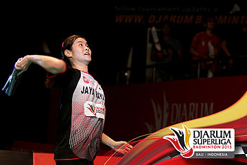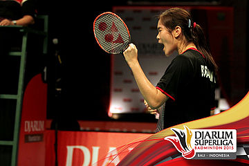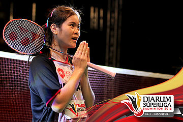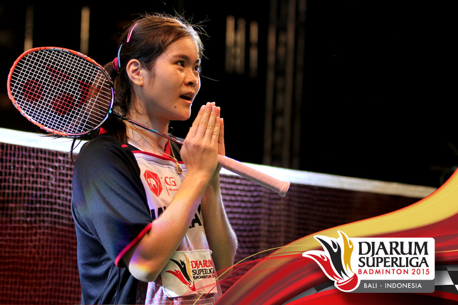 Busanan Ongbumrungpan (Jaya Raya) saat melemparkan merchandise Djarum Superliga 2015 ke arah penonton.