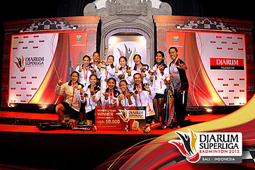 Juara putri Djarum Superliga 2015, Jaya Raya (kanan) dan runner up putri Djarum Superliga 2015, Renesas Jepang berfoto bersama.