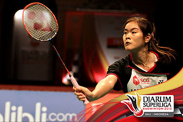 Busanan Ongbumrungpan (Jaya Raya) mengembalikan shuttlecock ke arah Ayumi Mine (Renesas Jepang).