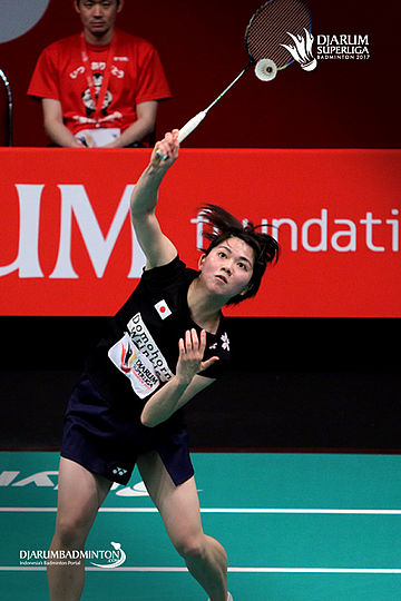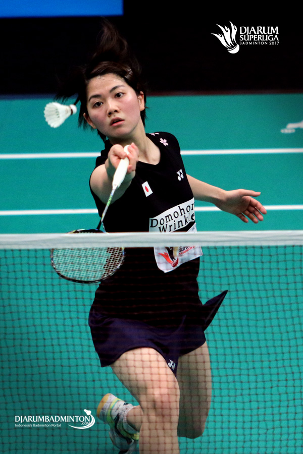 Yukino Nakai (Kumamoto Saishukan) bersiap menyambar pengembalian.