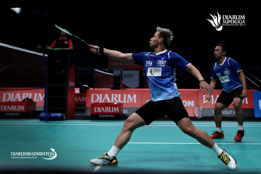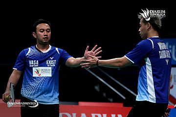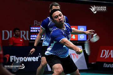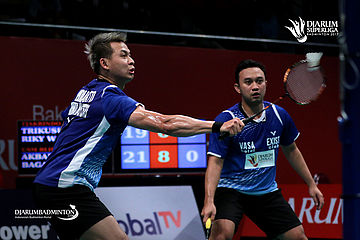 Kekompakan Riky Widianto/Trikusuma Wardana (PB Tjakrindo Masters) di lapangan.