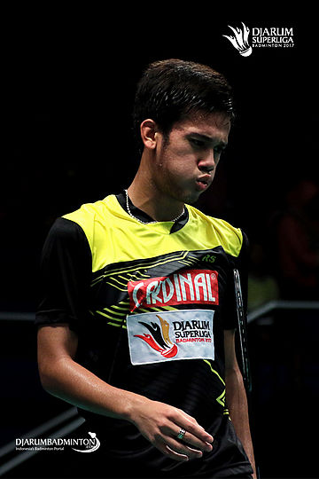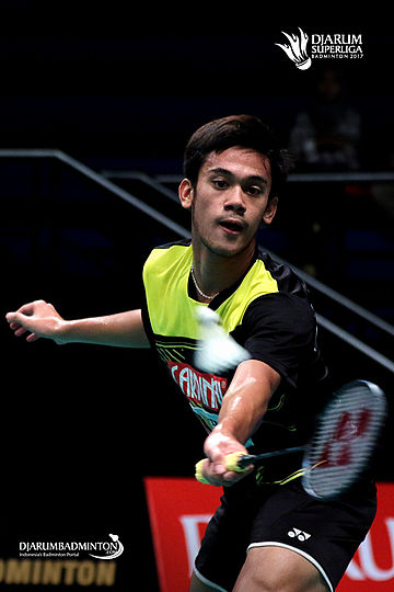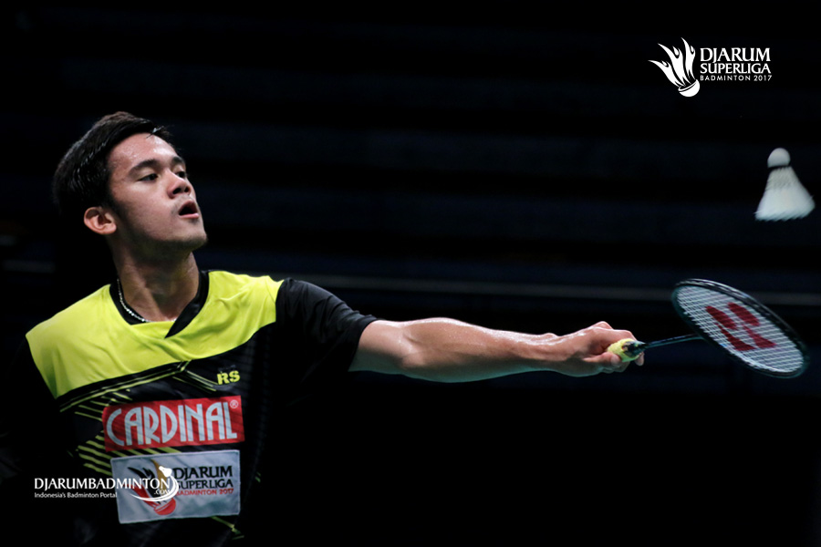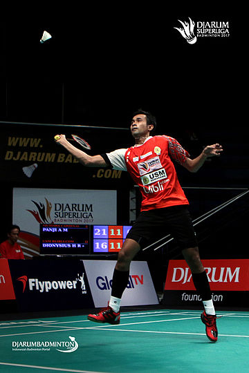 Firman Abdul Kholik (PB Mutiara Cardinal) melepaskan serve.
