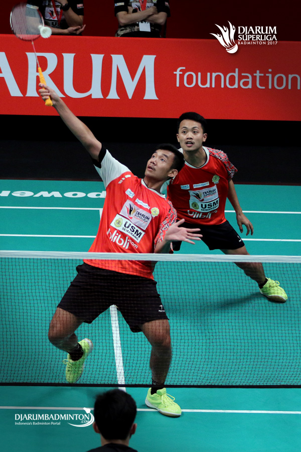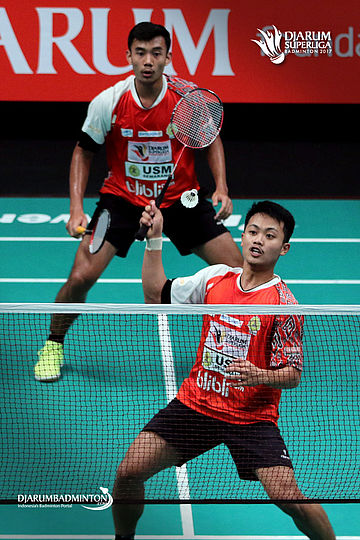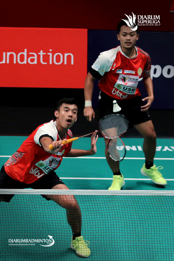 Akbar Bintang Cahyono/Bagas Maulana (USM Blibli.com) mengembalikan shuttlecock.