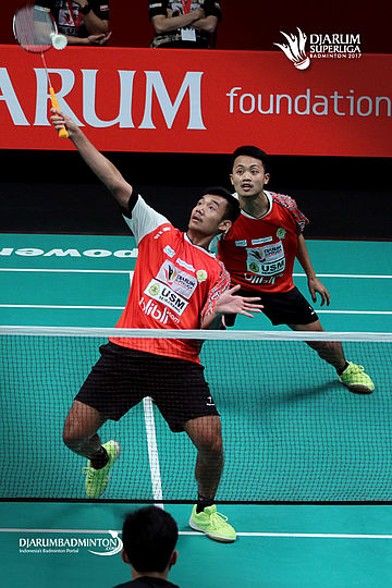 Reinard Dhanriano/Ricky Karanda Suwardi (PB Mutiara Cardinal) bersiap menyambar pengembalian.