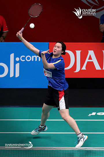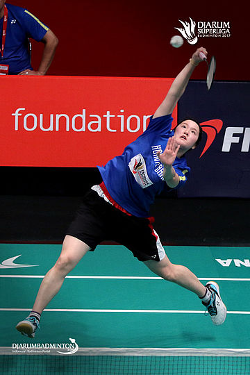 Nakamura Yuri (Hokuto Bank Jepang) mengembalikan shuttlecock.