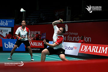Melati Daeva/Rosyita Eka Putri (PB Djarum) bersiap menghadang serangan.