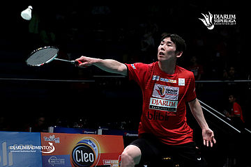 Son Wan Ho (PB Djarum) mengembalikan shuttlecock.
