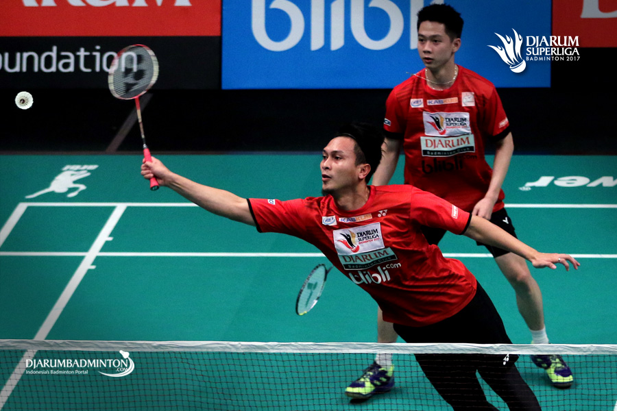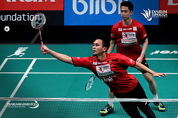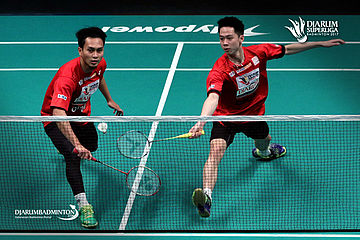 Mohammad Ahsan/Kevin Sanjaya (PB Djarum) menyambut pengembalian.