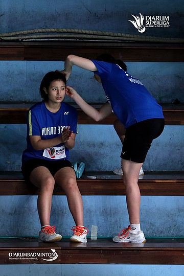 Dua pemain Hokuto Bank Jepang sedang mengikat rambut.