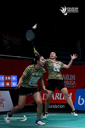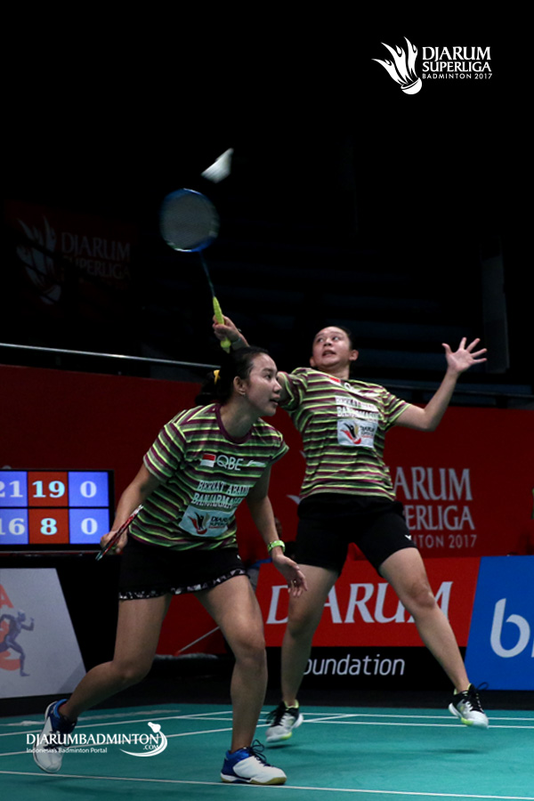 Devi Tika Permatasari/Keshya Nurvita Hanadia (PB Berkat Abadi) mengembalikan shuttlecock.