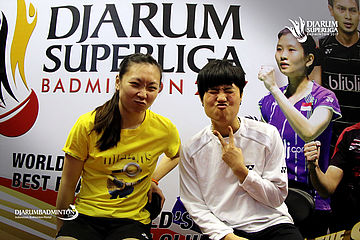 Zhang Beiwen dan dan Yip Pui Yin berpose duck face saat Meet and Greet.