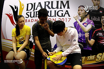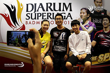 Zhang Beiwen dan dan Yip Pui Yin memberikan tanda tangan kepada salah satu pengunjung.