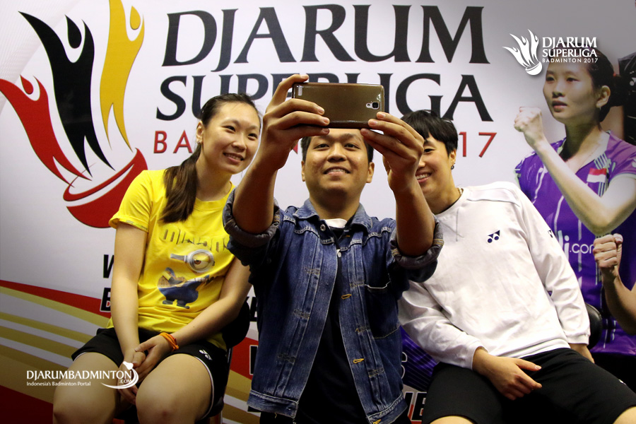 Salah satu pengunjung melakukan selfie dengan Zhang Beiwen dan dan Yip Pui Yin.