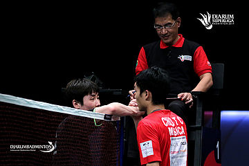 Son Wan Ho (PB Djarum) dan Chou Tien Chen (PB Musica Champion) bersalaman usai bertanding.