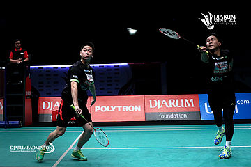 Kevin Sanjaya/Mohammad Ahsan (PB Djarum) bersiap menyambar pengembalian.