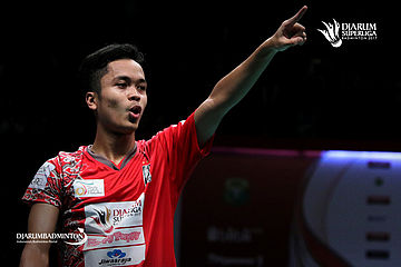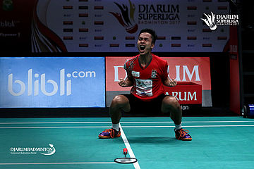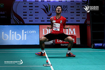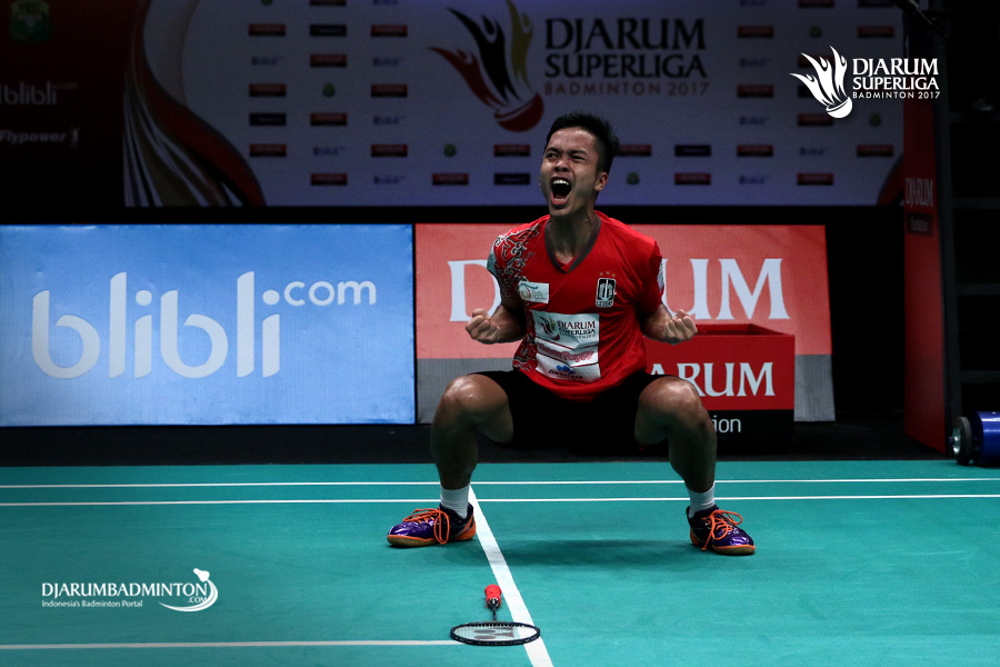 Selebrasi kemenangan Anthony Sinisuka Ginting (PB Musica Champion).