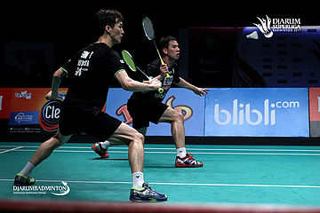 Ko Sung Hyun/Shin Baek Cheol (PB Djarum) menghadang serangan.
