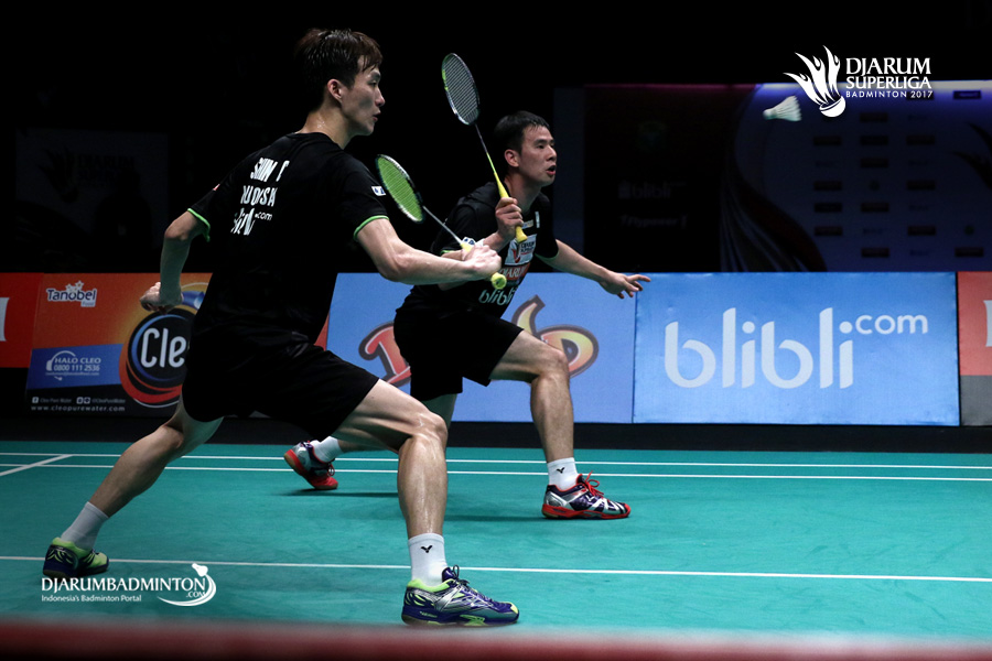Ko Sung Hyun/Shin Baek Cheol (PB Djarum) bersiap menghadang serangan.