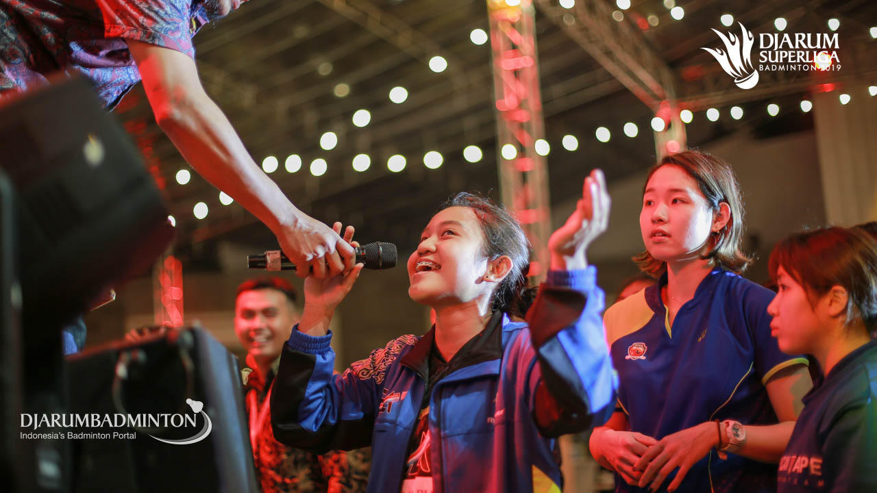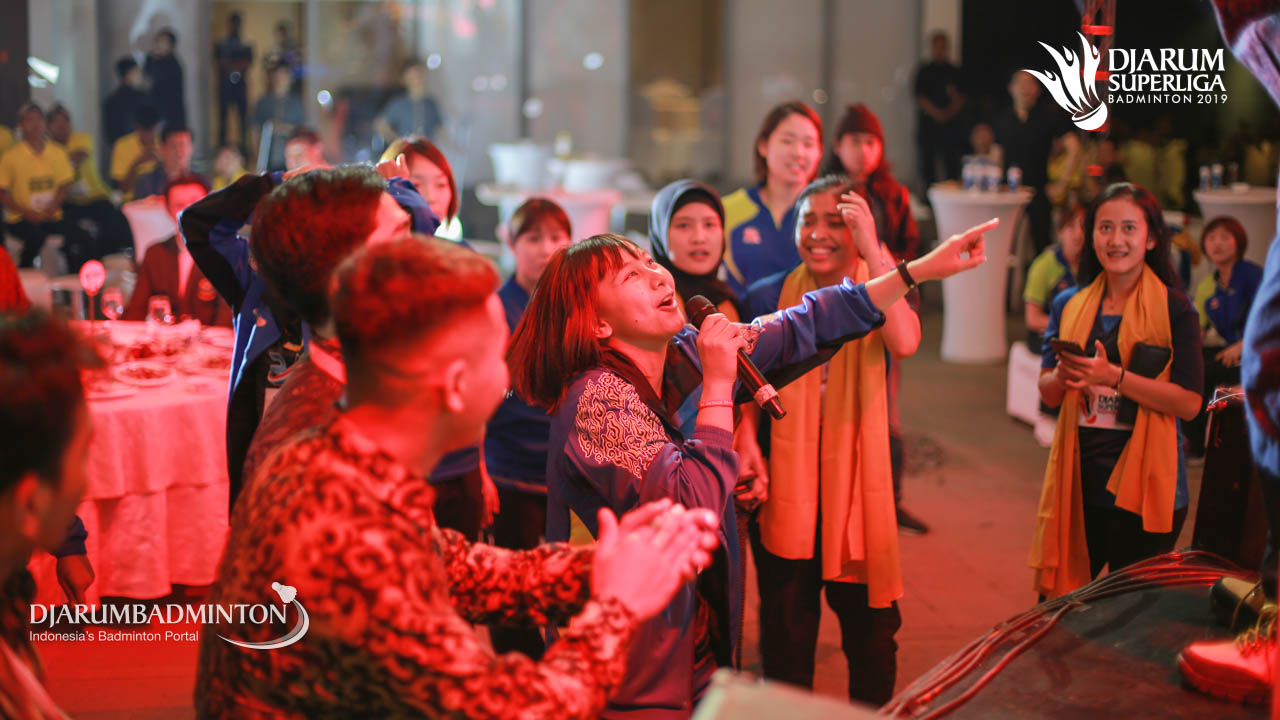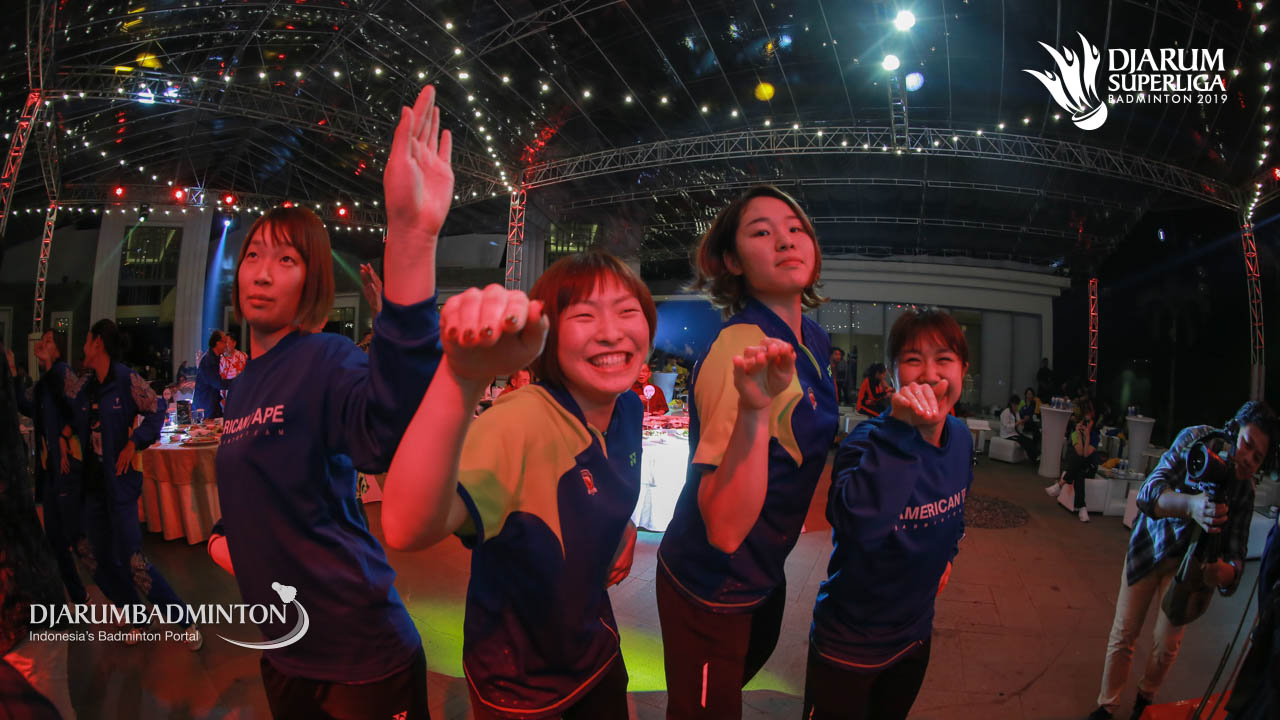 Keseruan Atlet Team Putri Samurai Japan Reptiles saat mengikuti acara hiburan pada Gala Dinner Djarum Superliga 2019