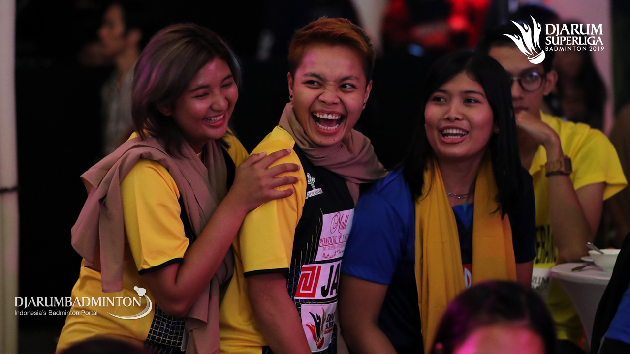 Jauza Fadhila Sugiarto, Apriyani Rahayu, Yulfira Barkah terhibur saat menikmati gala dinner Djarum Superliga Badminton 2019.