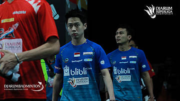 Kevin Sanjaya Sukamuljo/Mohammad Ahsan (Djarum Kudus) memasuki arena pertandingan