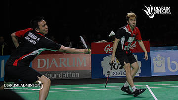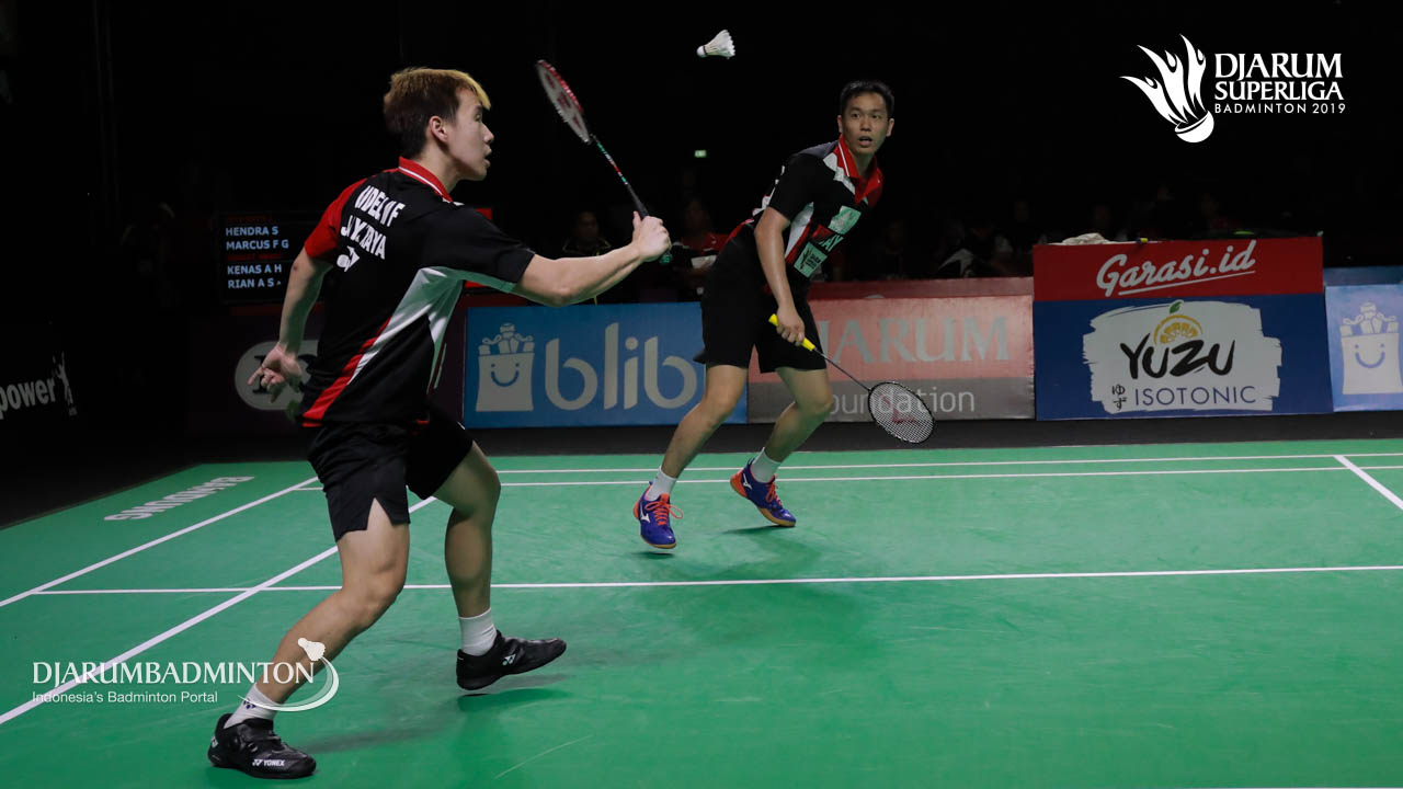 Hendra Setiawan/Marcus Fernaldi Gideon (Jaya Raya Jakarta) menahan serangan
