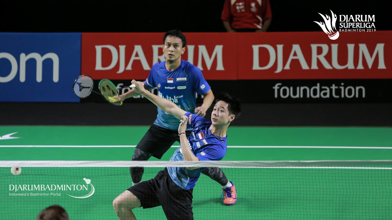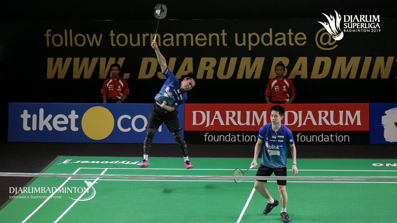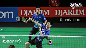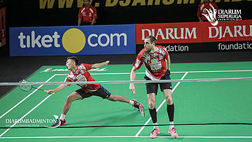 Kevin Sanjaya SUKAMULJO+Mohammad AHSAN (DJARUM KUDUS) mengembalikan shuttlecock