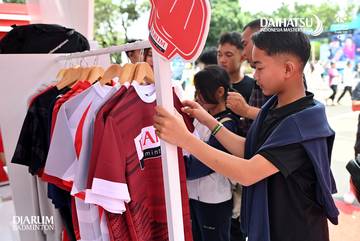 Seorang pengunjung tengah memilih jersei PB Djarum di stan Bakti Olahraga Djarum Foundation