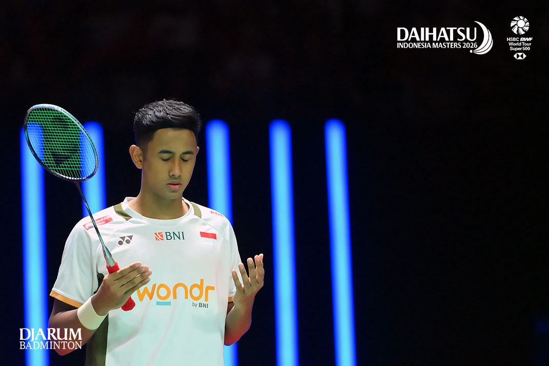 Toh Ee Wei (Malaysia) melempar kaos ke penonton di Istora GBK